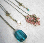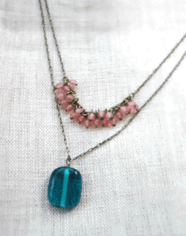 深いグリーンとサーモンピンクのダブルネックレス。アジャスターの先に異なる、 (淡水パールとアゲート)をつけました。脱着の際に後ろ手の混乱を免れます。 |
